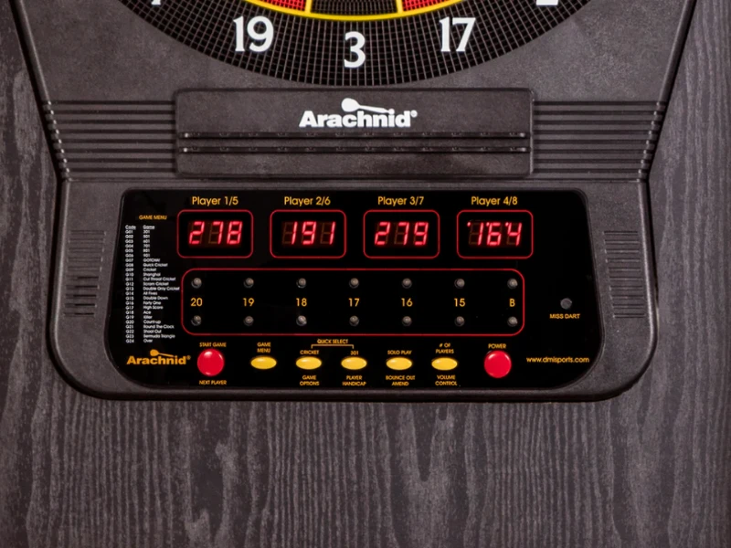 - Turn your rec room into an arcade with this Arachnid Arcade Style Cabinet with Cricket Pro 650 Electronic Dart Game. This black freestanding cabinet with Bullshooter logo houses the feature-packed CricketPro 650 Electronic Dart Game, which includes a regulation 15.5″ target area and 24 games with 132 options, including 5 cricket games. The LED display keeps score for up to eight players at one time, so you can have plenty of friends over for arcade-style fun. The cabinet has convenient storage with three shelves plus additional storage space under the lid for all of your darting accessories. Assembly required. Dartboard accessories included.