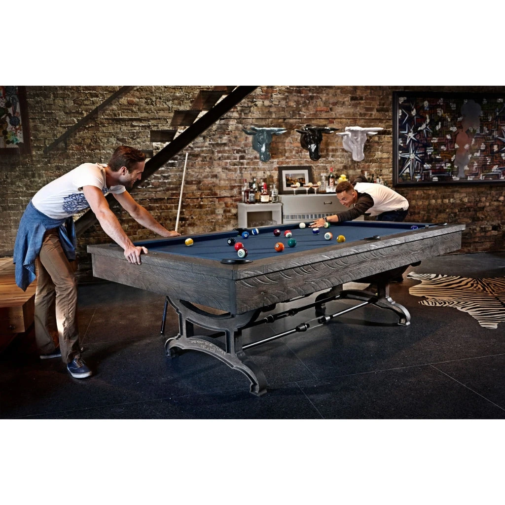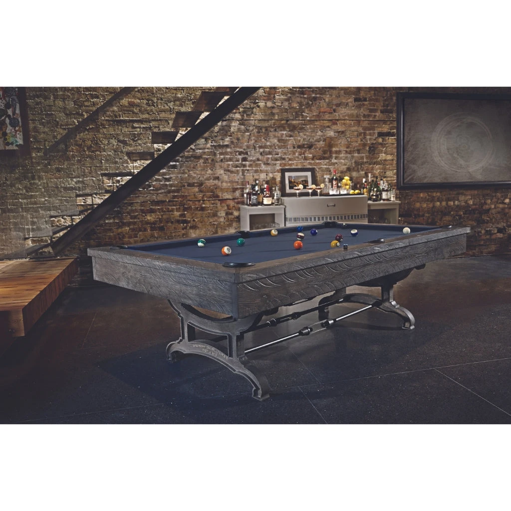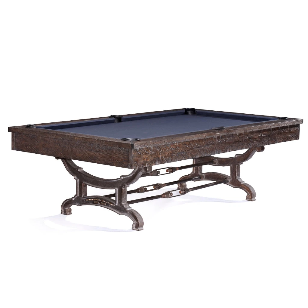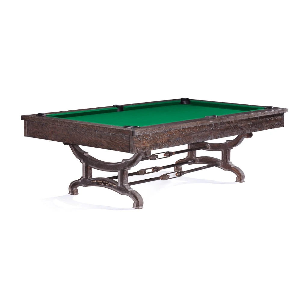 The Brunswick Billiards Birmingham Pool Table blends tough charm with an industrial loft-style vibe. This combination makes it an ideal fit for modern game rooms with a vintage feel. The distressed, rough-hewn finish, complete with a cast iron pedestal and turnbuckle stretcher, gives the Birmingham billiard table a stylish and rustic feel down to every detail.