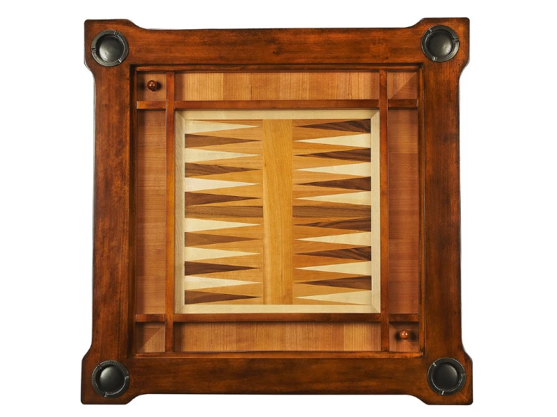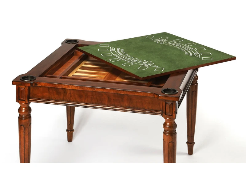 - Play a variety of games on this stylish table that is veneered with antique cherry finish. The top inset has a game board for chess and checkers. Flip the inset over and it converts to a green felt-lined blackjack table. Remove the insert altogether and the well(beneath the inset) is a backgammon game board. Four glass holders on each corner. Chess and other game pieces are not included.