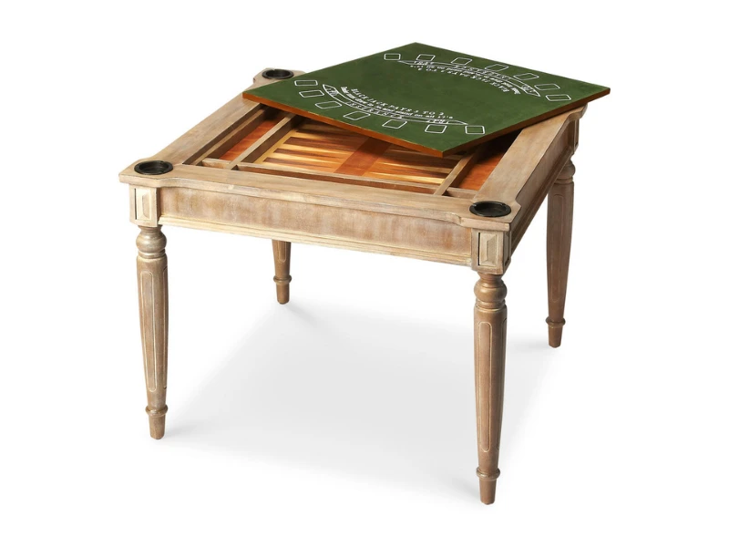 - Play a variety of games on this stylish table that is veneered with a DriftWood finish. The top inset has a game board for chess and checkers. Flip the inset over and it converts to a green felt-lined blackjack table. Remove the insert altogether and the well (beneath the inset) is a back-gammon game board. Four glass holders on each corner. Chess and other game pieces are not included.