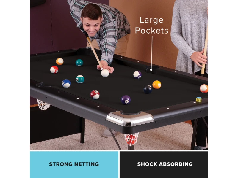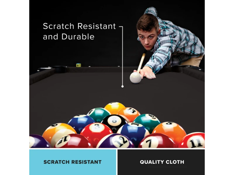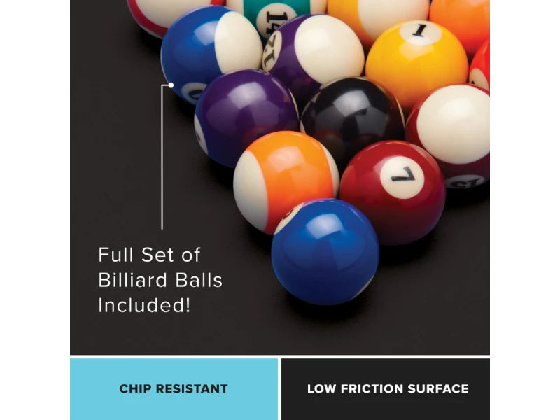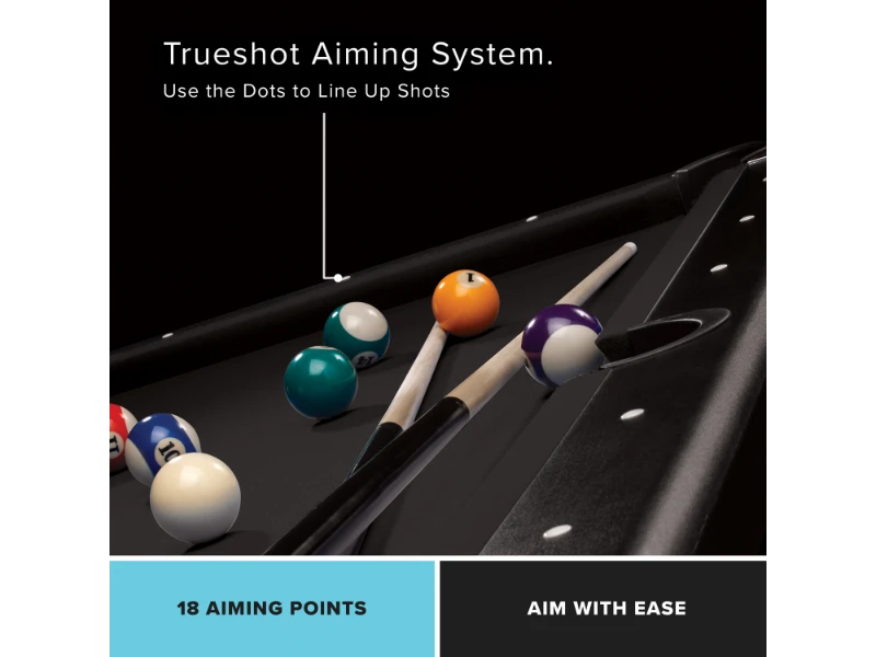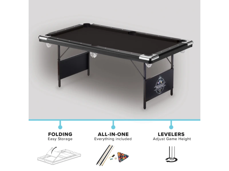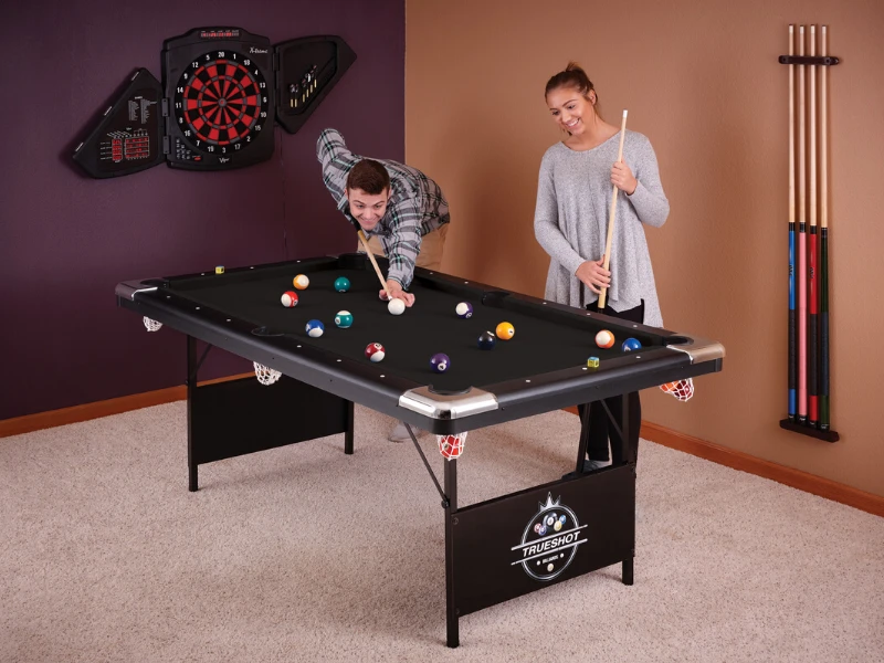- For quick and easy fun, there’s none better than the Trueshot Billiard Table with foldable legs. This innovative design couples compact design with surprising portability. For those that are tight on space and want to enjoy their favorite classic table game, the Trueshot is the perfect solution! Featuring high strength material means not sacrificing quality for space, as the surface of the Trueshot table will be sure to play smooth and fast. Featuring a sleek black cloth design, this table will complement any decor. The included Play Package features a full set of 2.25″ billiard balls, two 57″ cues, triangle and table brush to get you started playing out of the box.