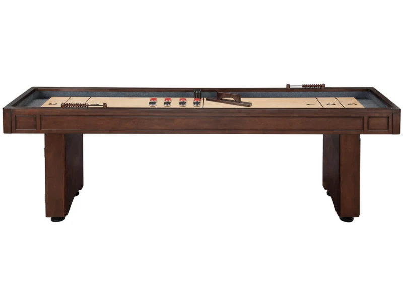 - With classic detailing and a rich, mahogany finish, the Austin Shuffleboard Table will be the statement piece of your game room. A 1.5-in thick play surface is wrapped in a white maple veneer and finished with a high-gloss, scratch-resistant coating. The interior walls and gutters are lined with shock-and sound-absorbing carpet.