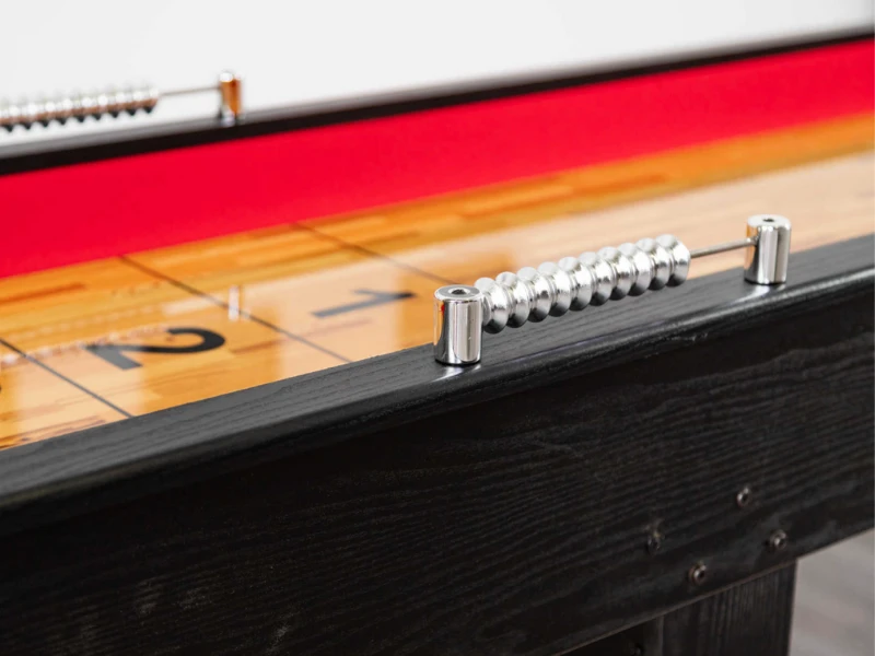 - The 9-ft Avenger is the perfect table to introduce the exciting and fun game of shuffleboard to your family and friends, right in the comfort of your own home. The beautiful, black melamine cabinet and sturdy, pedestal legs with adjustable leg levelers provide optimum stability and level play. The Avenger features a super slick, poly-coated playing surface for smooth sliding action and padded gutters that reduce noise during play. It is crafted from engineered wood for durability. Assembly required. 180-day limited warranty.