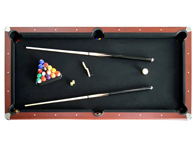 - FREE Accessories: Includes Pool table accessories: (2) 2-piece 57-in pool cues, 2-1/4-in billiard balls, plastic racking triangle, felt-matching Black cue chalk, net, posts, 2 paddles, and 2 table tennis balls