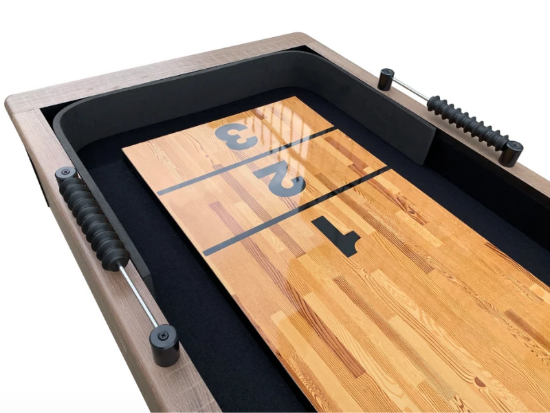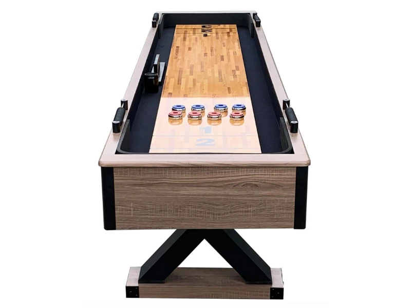 - The 9 ft. Excalibur Shuffleboard table is crafted from engineered wood featuring a sturdy, X-pattern support base that delivers rock solid stability. The well-built cabinet is covered in a beautiful rustic Driftwood melamine finish that showcases the natural imperfections of reclaimed wood. This handsome table features a super slick, poly-coated play surface for smooth sliding action and carpeted gutters that reduce noise during play. The upscale farm house design and high-quality components create a stylish look built to last!