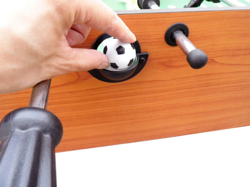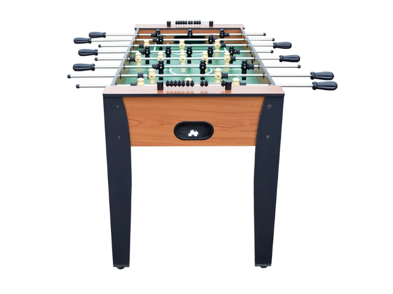 - The Hurricane 54-in Foosball Table in Dark Walnut is engineered to bring family fun and excitement right into the comfort of your home. Designed for recreational fun and competition, this table is perfect for players of all ages. The cabinet is constructed from CARB certified MDF and supported by four sturdy L-shaped legs with adjustable leg levelers to keep your table balanced on uneven surfaces. The rich, dark Walnut and Black melamine cabinetry showcase the life-like grass playfield creating a handsome looking table that plays great. Includes four quality foosballs. 180-day limited warranty.