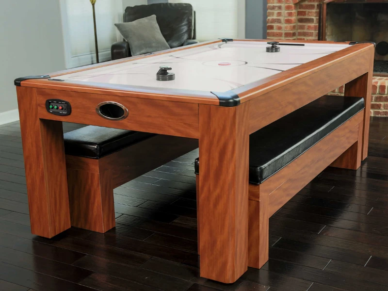 - The handsome, multi-functional Sherwood Air Hockey Table is crafted from sturdy, CARB certified, MDF material featuring clean lines covered in a beautiful light Cherry melamine that showcases the rich grain of cherry wood. With its unique, in-rail, electronic scoring display, the Sherwood easily converts from a dining or craft table to a full-blown competitive table tennis or air hockey table. No raised scoring unit to get in the way! The super-slick play surface and competition air blower system delivers accurate air hockey table play. The Sherwood is designed and built to withstand vigorous table play. Includes matching benches with built-in storage and soft padded seat cushions that provide comfortable, convenient seating while keeping your game accessories close to the table and organized. 180-day limited warranty.