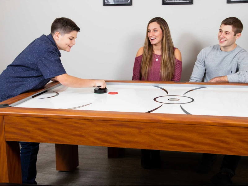- TRADITIONAL STYLE – The Sherwood Air Hockey Table will be the centerpiece of your game room, basement, or rec room. Inspired by rich cherry wood, the table’s replicated wood grain finish will add fun and warmth to any room in your home.