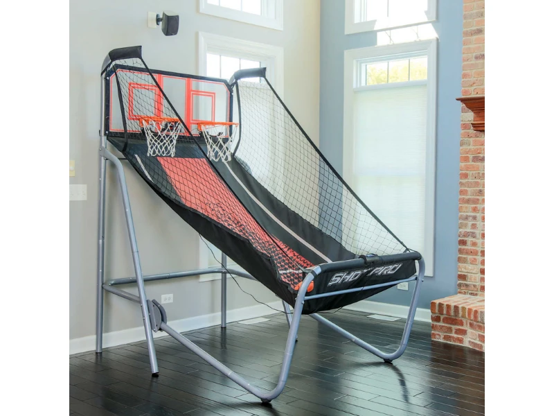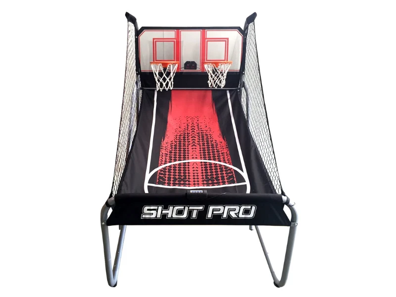 - The Shot Pro Deluxe Arcade Style Basketball Game brings the excitement and thrills of basketball into the privacy of your own home! Unlike other home style basketball games, this commercial-grade game is built to last. It features a heavy-duty, 1.75-in diameter, rigid steel support frame. The sturdy acrylic backboard includes two heavy duty 12-in rims with built-in electronic scoring levers for automatic, accurate game scoring. The electronic scoring unit features 8 exciting game options and keeps track of the game time. This basketball game will provide hours of fun and competitive play for the whole family. When you’re done playing, simply fold the Shot Pro into a space saving position for easy storage. 180-day limited warranty.