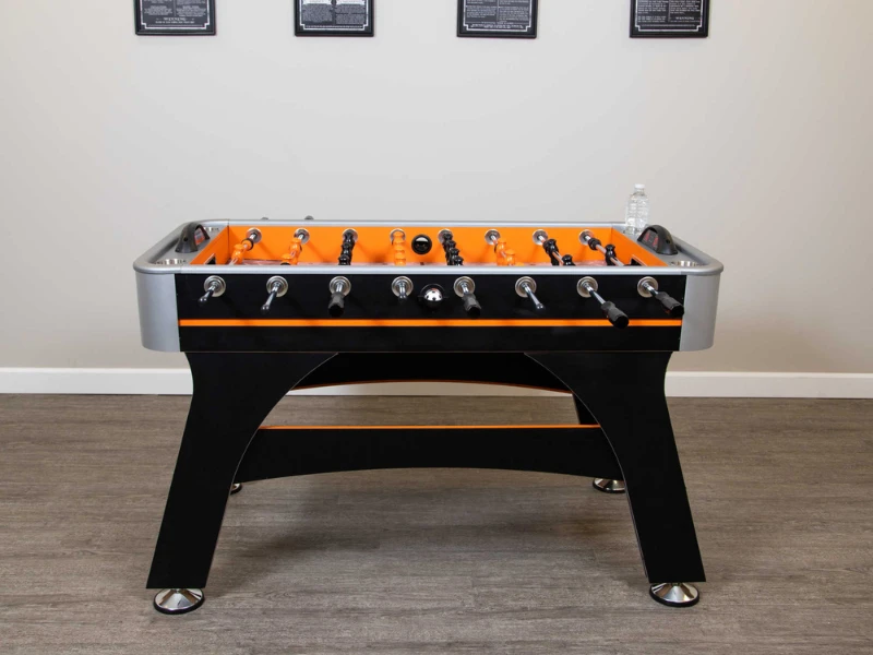 - This striking foosball table is sure to dazzle your friends and family. Bright orange details combined with a chrome trim create a striking contrast. The foosball men are also black and orange and are counter-balanced with E-Z spin bearings to ensure smooth and consistent gameplay. The Trailblazer’s scoring system is state-of-the-art, with an electronic unit that keeps track of every goal. This high-tech system includes fun, immersive effects, putting you right in the middle of the action. Built-in drinks holders keep refreshments on hand throughout your game. Four 36-mm ABS, high-quality foosballs are included.