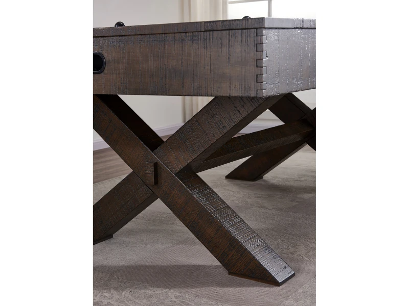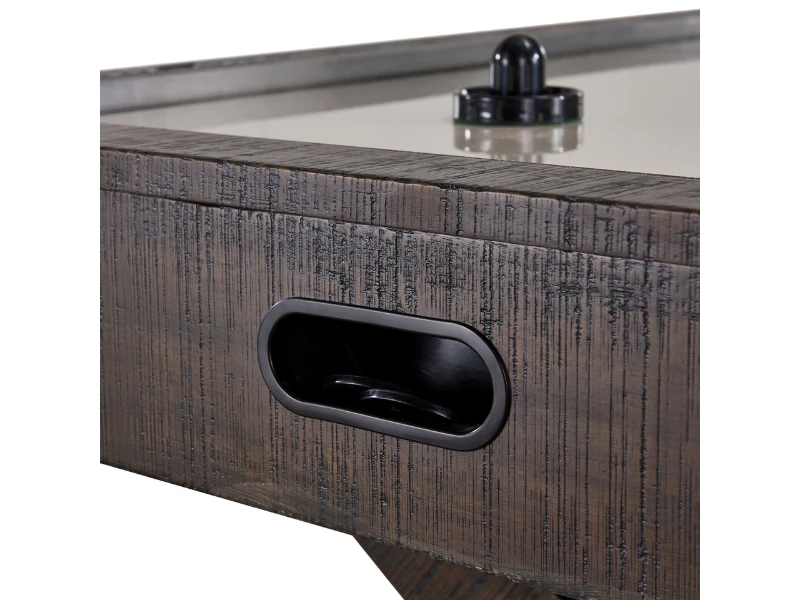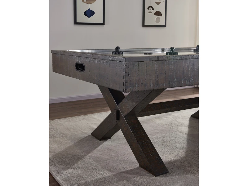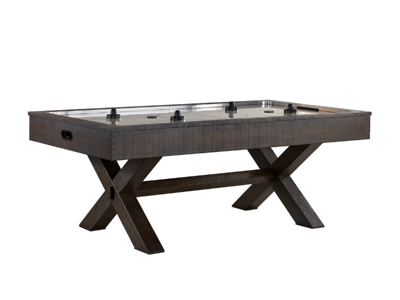 - The Homestead Air Hockey Table combines smooth air hockey gameplay with a distinctive rustic style. The table features a worn finish in Cappuccino that blends with any room décor. Unique x-shaped legs and crossbeam add both style and support to the game’s minimalist design. The table includes 4 pucks, 4 goalies, and 2 manual inset scoring systems as well as adjustable leg levelers and a powerful single fan for optimized gameplay.