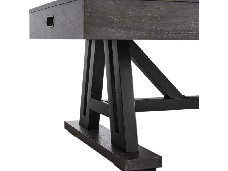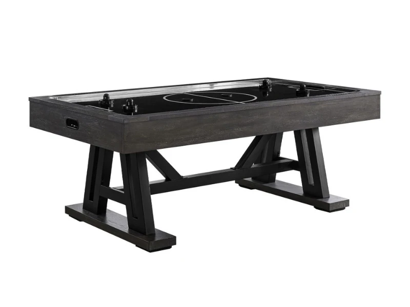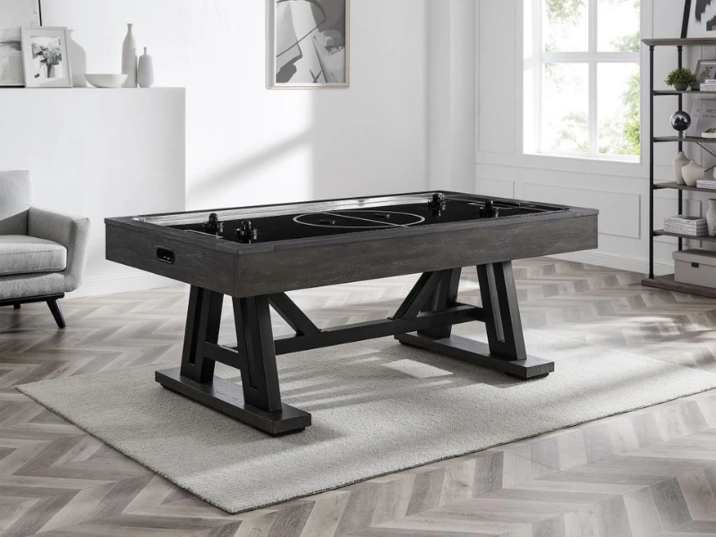 - Introduce fun and farmhouse flair to your game room with the Shelton Air Hockey Table. The table features a rustic-modern design, with a sturdy metal base design that keeps the game going into overtime. The single, powerful 120VAC 60Hz fan provides strong airflow for fast-paced gameplay. The 2 manual, inset scoring systems allow the table to accommodate a table tennis conversion top that adds to the excitement of this versatile game table. It boasts a regulation-size field with a minimalistic playfield design for hours of fun. The included quality accessories provide all you need to get your game on.