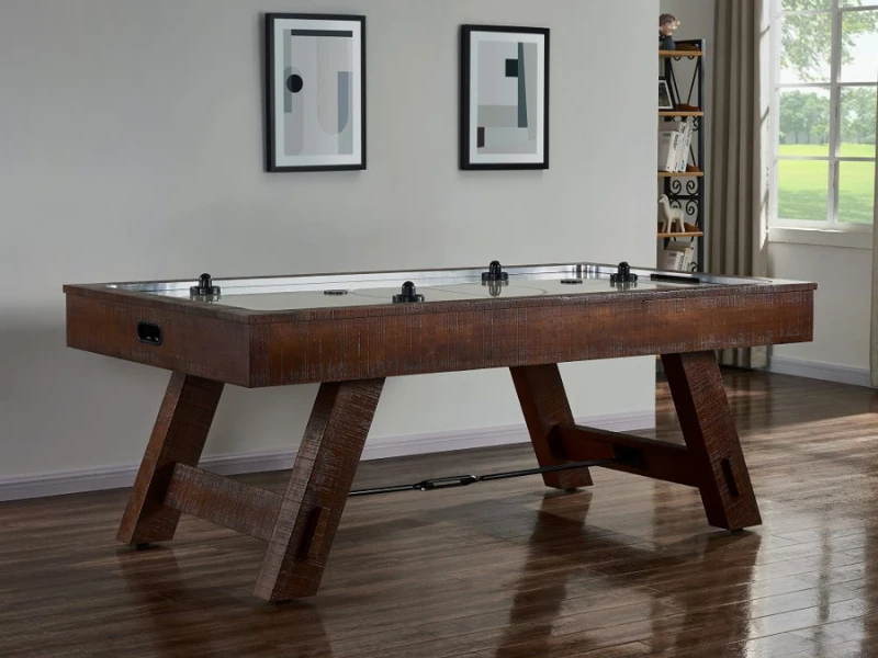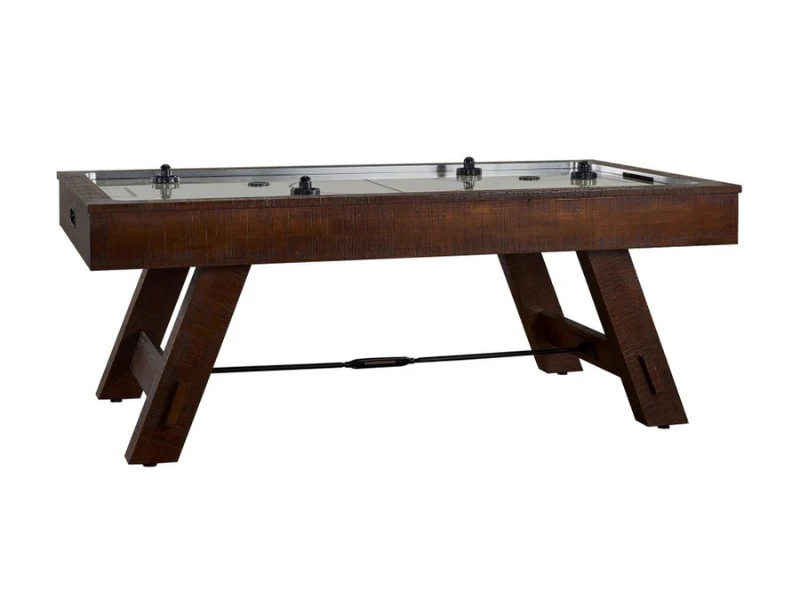 - The Telluride Air Hockey Table in rustic brown finish warms up any décor with its modern country style and decorative metal accents. Sturdy wooden legs supported by a unique metal crossbar lend strength for bolder competition. The timeless playfield design includes two manual inset scoring systems, a powerful single fan, and adjustable leg levelers, with quality accessories to provide hours of superior hockey gameplay.