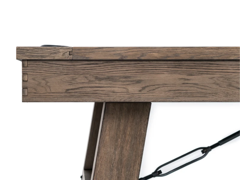 - Isaac, with its steel turnbuckle, solid oak angled legs, and finger-jointed rails, Isaac makes for a stunner of a pool table. Grey tones wash over solid oak, creating a truly unique finish.
