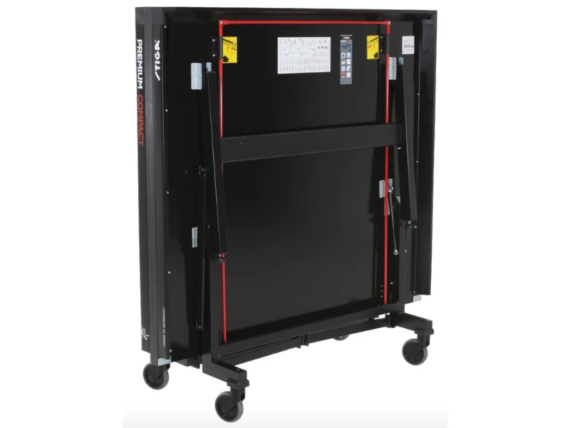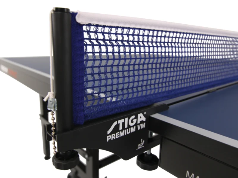 - The Premium Compact features the most compact storage available at only 22 inches deep. The indoor table is delivered 100% pre-assembled. All you have to do is open the table to enjoy tournament-level performance. Commercial-grade pistons assist with opening and closing the table, which can be done by only one person, in one motion. This industry-leading innovation is only available from STIGA. The 25mm thick table top meets ITTF regulations for tournament-level performance. The table top is sanded and UV filled prior to multiple coats of specialty paint and finished with a clear top coat for a perfectly smooth finish in classic tournament blue color. Massive 2-1/4 x 1-3/4 (inches) legs are made of heavy-gauge steel for a rock solid base. Leg levelers allow the table to be adjusted on all four corners for a playing surface that is perfectly level, even when the floor is not. Five-inch machine-grade ball-bearing casters allow the table to smoothly roll over almost any surface for maximum transportability. Regulation white striping is silk-screen printed for a smooth playing surface. Unlike other methods that are applied like a sticker and create a noticeable imperfection, the silk screen process prints the ink directly on the table for a surface that is smooth to the touch. A 2-2/5 inches profiled steel apron supports the top for even bounce across the entire table top. The Premium Compact includes a net and post set featuring a premium cotton blend net and precision tension adjustment for a tournament quality net that is International Table Tennis Federation (ITTF) approved.