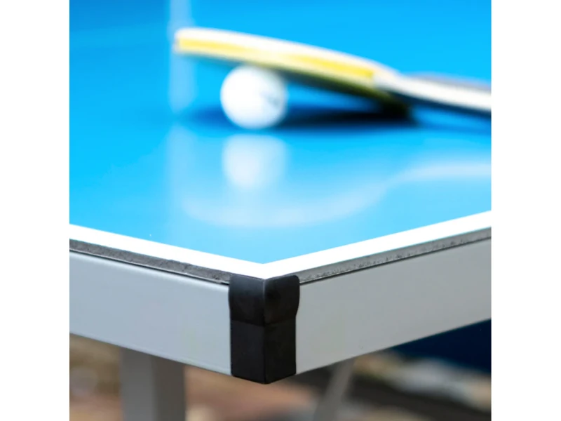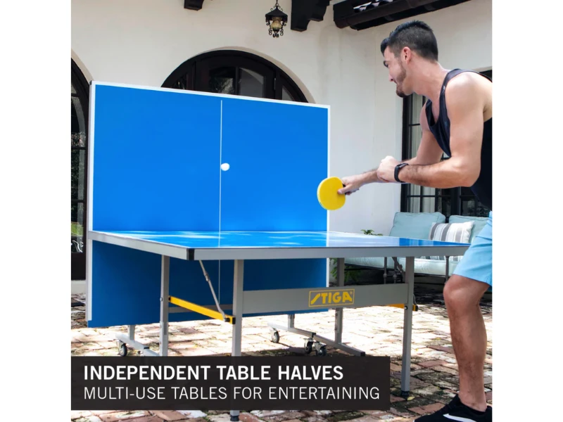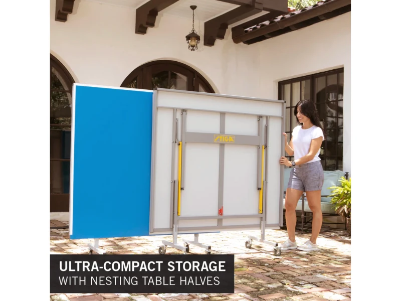 - Skip the stress of rearranging furniture to fit a table tennis table inside your home and enjoy table tennis outdoors. The Vapor table is designed and manufactured with durable, all-weather materials such as aluminum, exterior grade powder coating, and galvanized steel for a table that is waterproof, and resistant to rust and sun damage, making it perfect for year-round outdoor storage in any climate. This table comes 95% preassembled with only one simple step to complete so you can begin playing in less than 10 minutes. The 6mm aluminum/composite top is supported by a stout 1.5″ tubular steel apron to deliver lively and even bounce across the entire surface and resists warping under any condition. The table includes a 72″ exterior grade net and post set with string tension adjustment for excellent playability. Below the table, sturdy 1.25″ welded steel legs include a self-opening feature, so they automatically deploy when opening or folding the table halves for added convenience and safety. The legs also include adjustable height leg levelers to ensure your table has a solid, level playing surface on any terrain. For added flexibility and mobility, the table features 3″ ball-bearing wheels that smoothly roll and lock into place for safety. This table includes playback mode for individual practice and each table half can be separated and used as a free-standing multi-purpose table for dining, playing cards, and more. After playing, conveniently fold each table half into the upright position, lock into place with the red safety latch, and roll to the desired location for convenient storage. The separate table halves of the Vapor nest together for an ultra-compact folded profile so it can fit into any space.