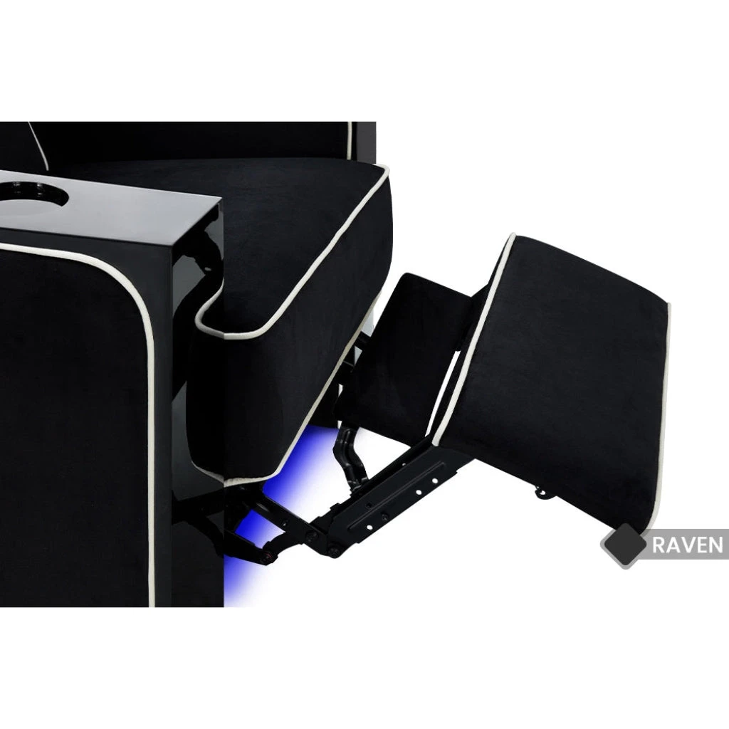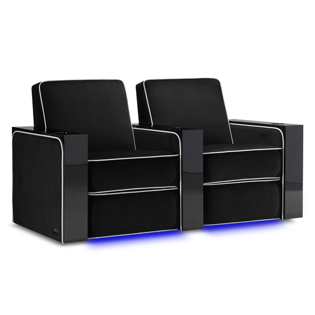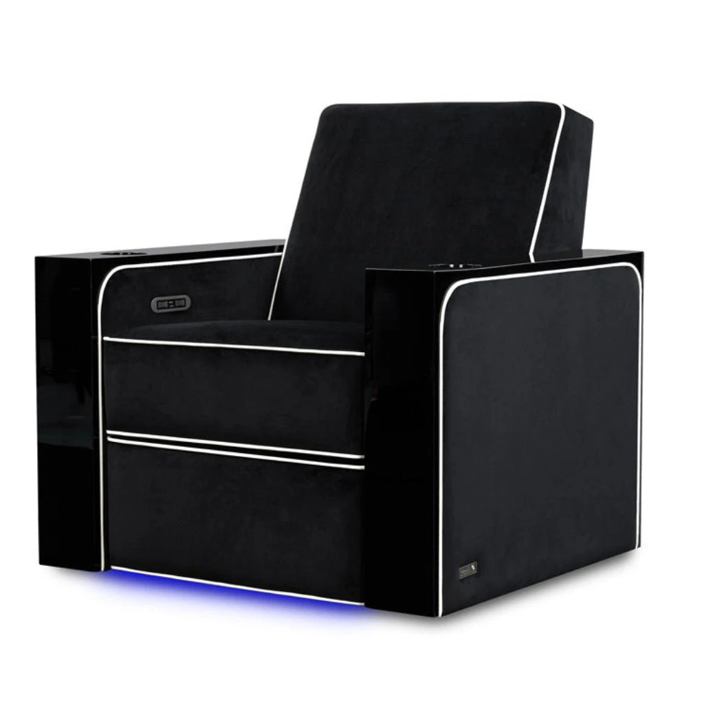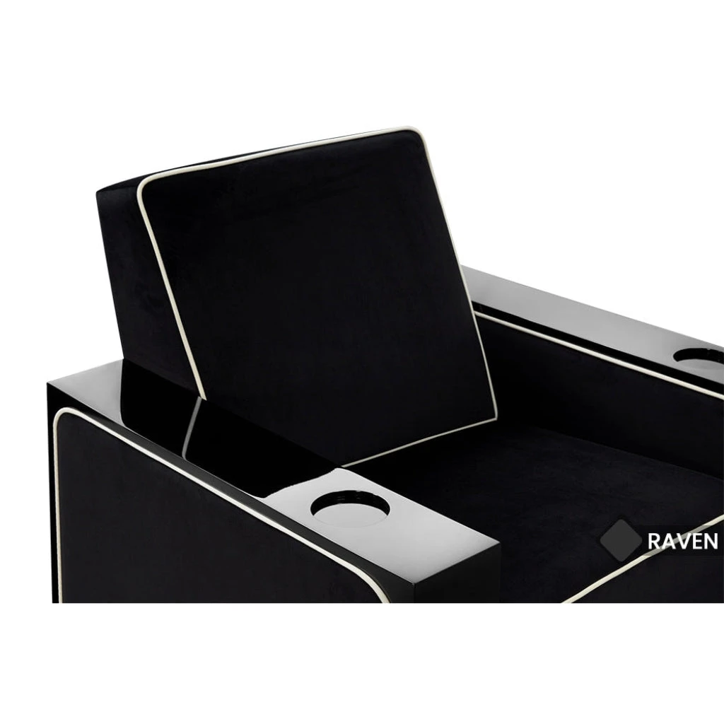 Relax in style with the Valencia Naples Elegance Home Theater Seating. Designed to look as refined as a Grand Piano, this chair features sleek Piano Black Wood armrests and soft Raven Parisian Velour fabric. The French Vanilla piping adds a classy touch, while the velour and low-profile headrest make it perfect for audiophiles, enhancing both comfort and sound quality.