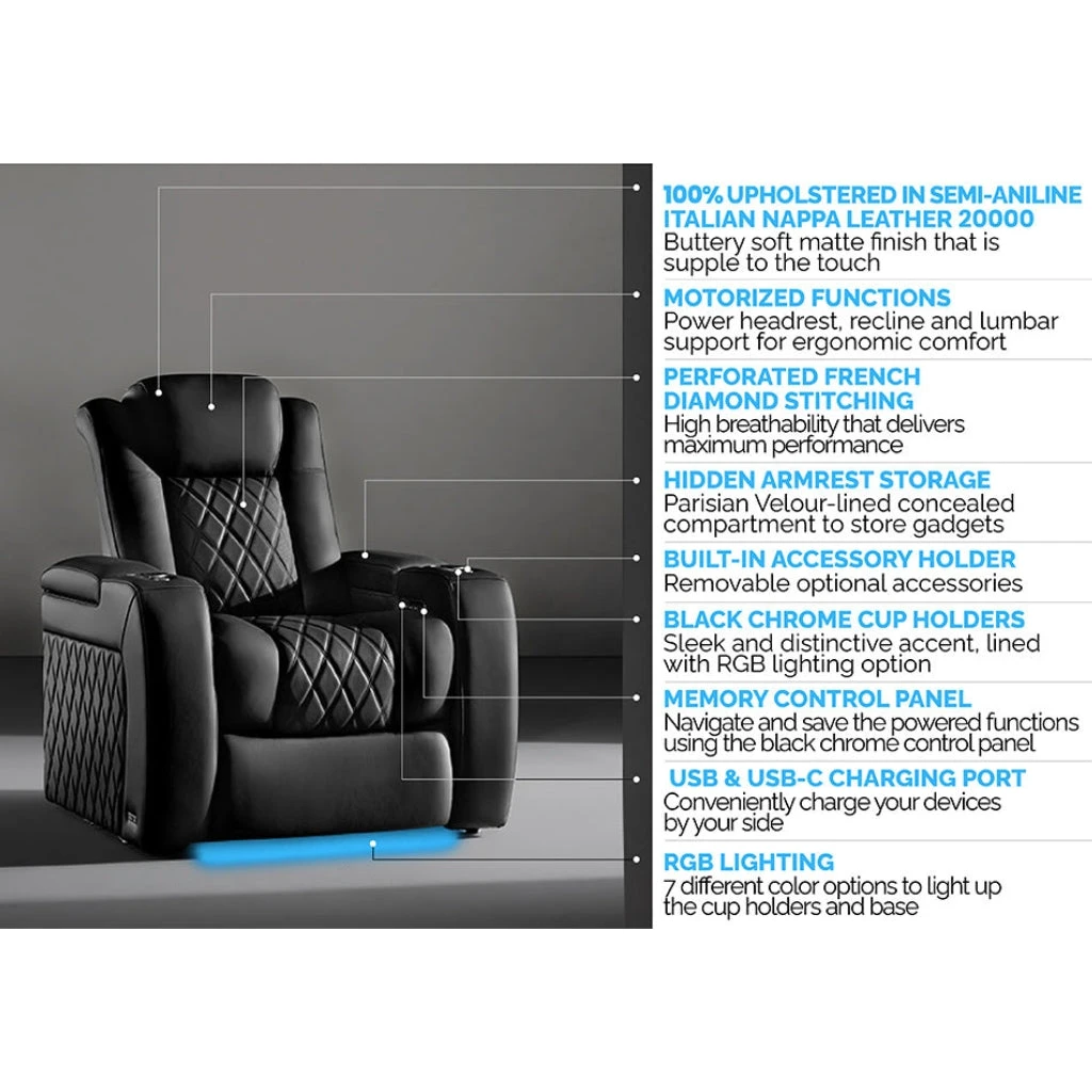 The Valencia Tuscany Ultimate Edition Home Theater Seating is the peak of home theater luxury. Wrapped entirely in ultra-smooth Semi-Aniline Italian Nappa leather 20000, this seat is built to impress. With bold design details, advanced comfort features, and a finish inspired by high-end cars, this chair redefines what it means to relax in style.